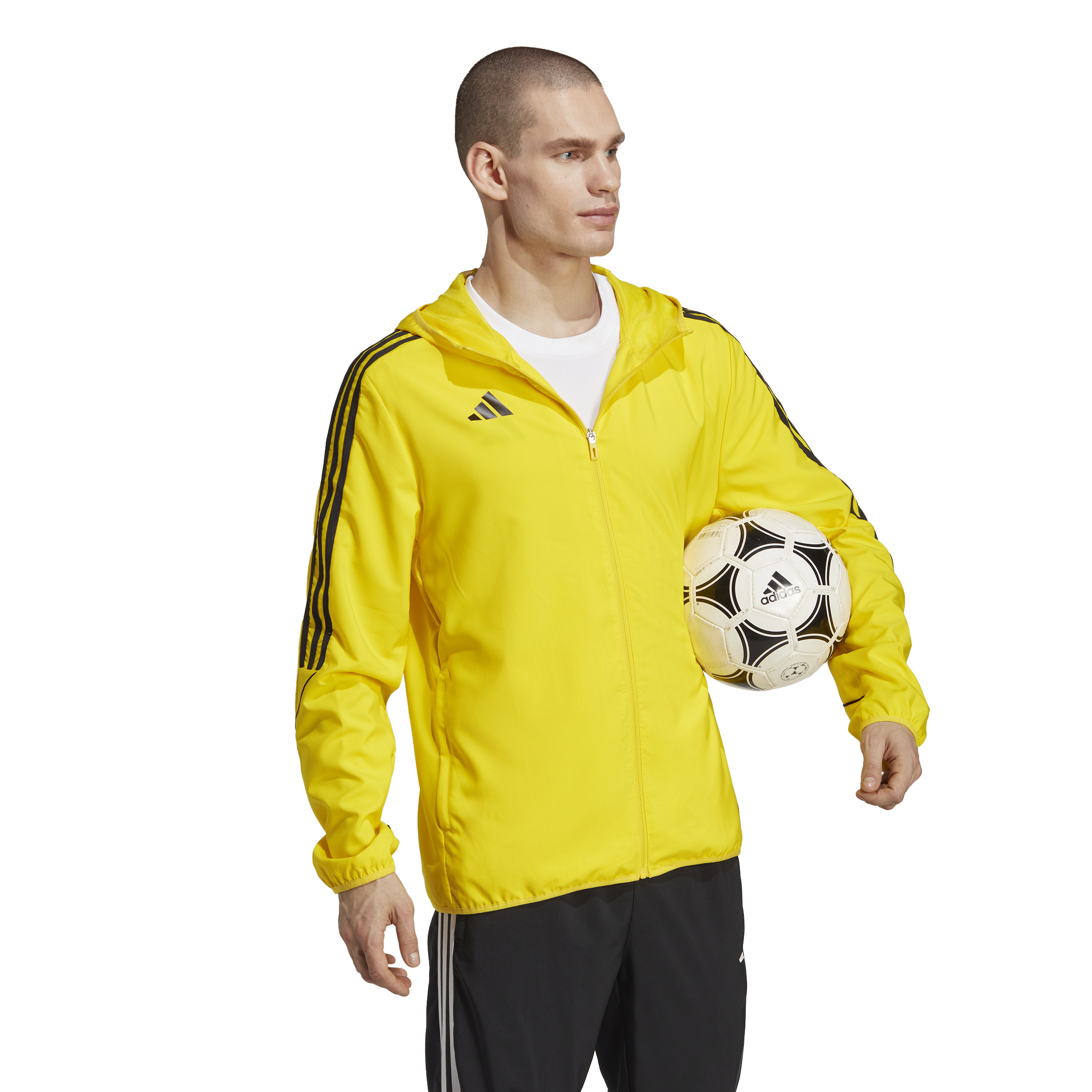 Správny futbalista nerieši, či zrovna svieti slnko alebo prší. Keď je čas hrať, tak sa ide na to. Túto futbalovú bundu adidas Tiro 23 League nosia hráči v nepriaznivom počasí, protože je vyrobená z vodeodolného tkaného materiálu a má elastické manžety. Ďalšiu ochranu pred dažďom ponúka praktická kapuca so sťahovacou šnúrkou.