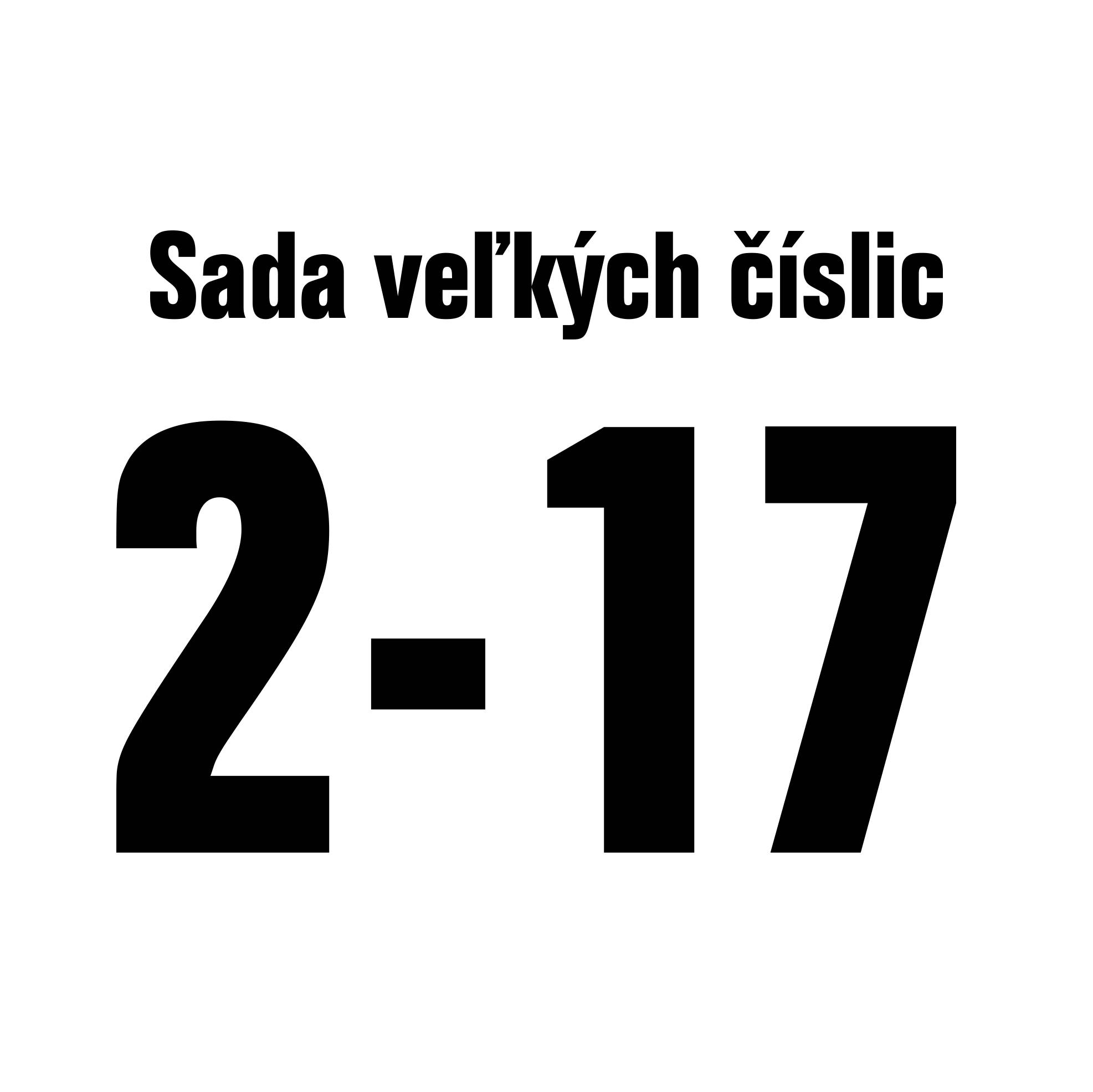 Sada číslic obsahuje veľké číslo na chrbát od čísla 2 až 17. Výška číslic pri detskom textile je 20cm a pri dospelom textile je 24cm.